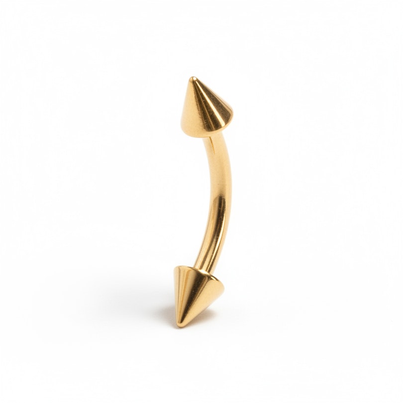 Szeretnél valami újat vinni a szemöldök vagy mellbimbó piercingedbe? Ennek a mesés ékszernek aranybevonata van, és a végein tüskék diszelegnek. Többféle hosszúsággal és szárvastagsággal kérheted, igy biztosan illeni fog a piercingedhez, Egy ilyen hajlitott szárú darab intimpiercingnek is tökéletes, de persze bármilyen piercingnek hordhatod.