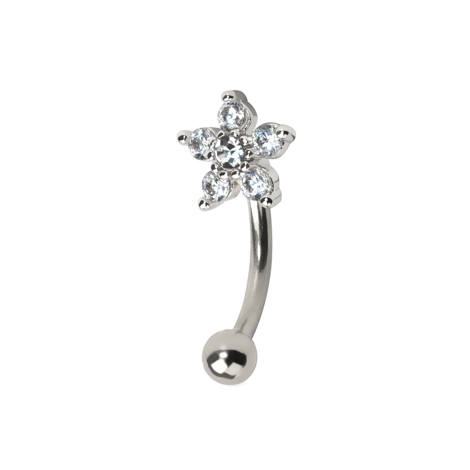 Ez a hajlított barbell (banán piercing) orvosi acélból, az őt díszítő virág pedig rézből készült. A virág rengeteg apró kis csillogó kővel van kirakva, ami igazán különleges, nőies külsőt ad az ékszernek.