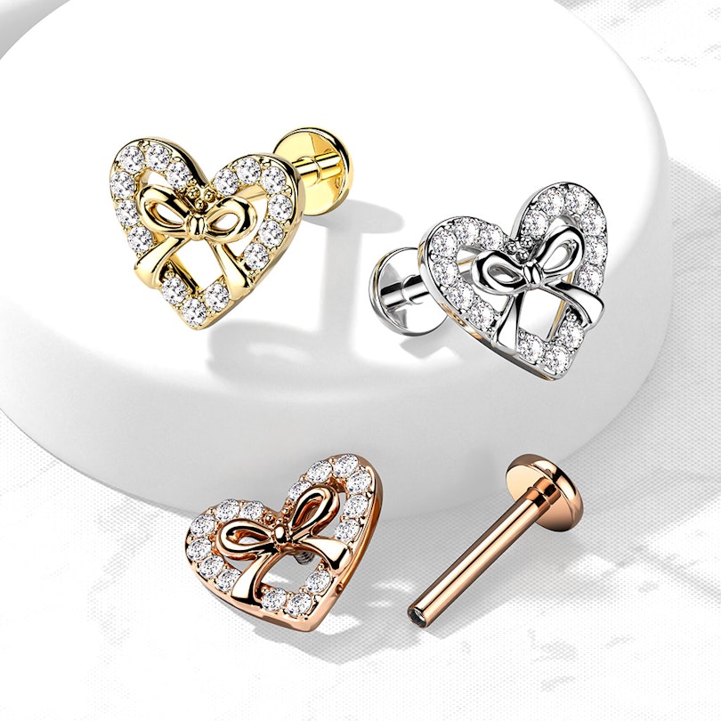 Ez a labret orvosi acélból készült, amely a piercingékszerek leggyakrabban használt alapanyaga. A szívet és a masnit sárgarézből formázták, és ródiummal, illetve PVD-vel van bevonva.