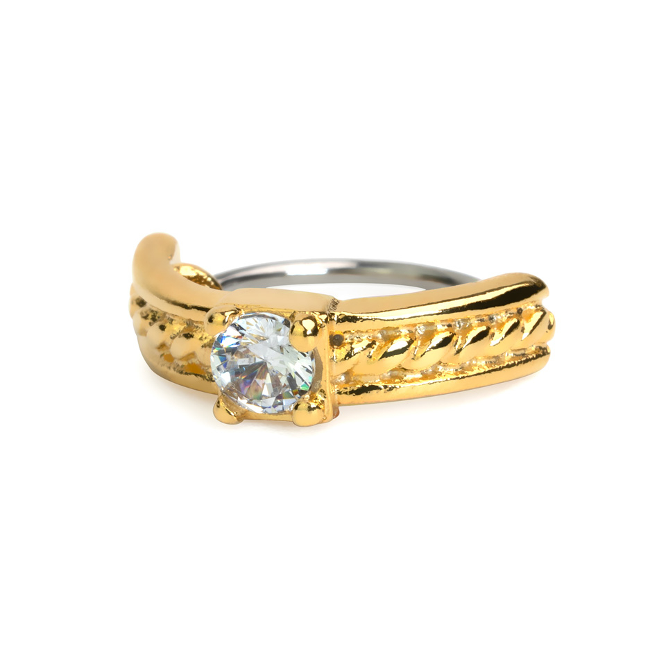 A karika bőröddel érintkező oldala orvosi acélból, a díszítés pedig sárgarézből készült. A behelyezéshez csavard az ékszert előre vagy hátra, hogy S-alakot formáljon. Miután átment a piercinglyukadon, összezárul.