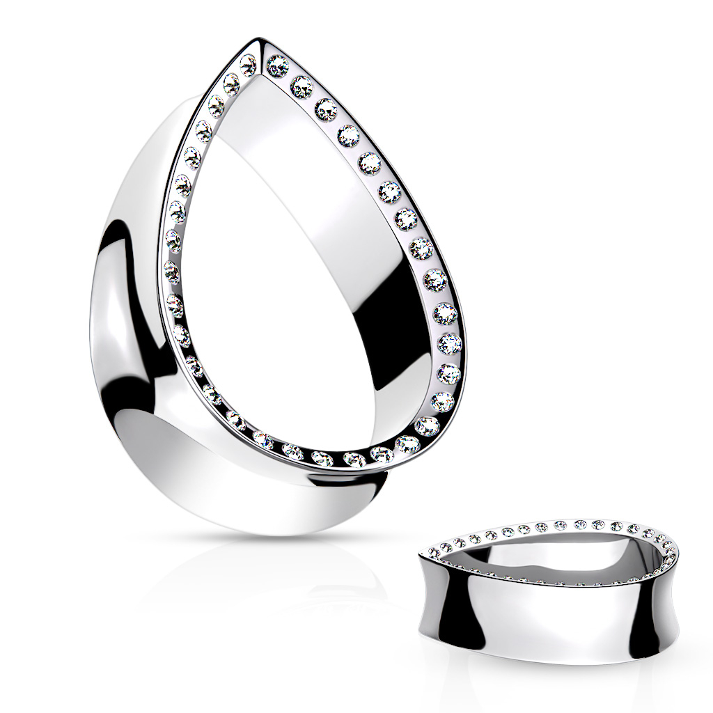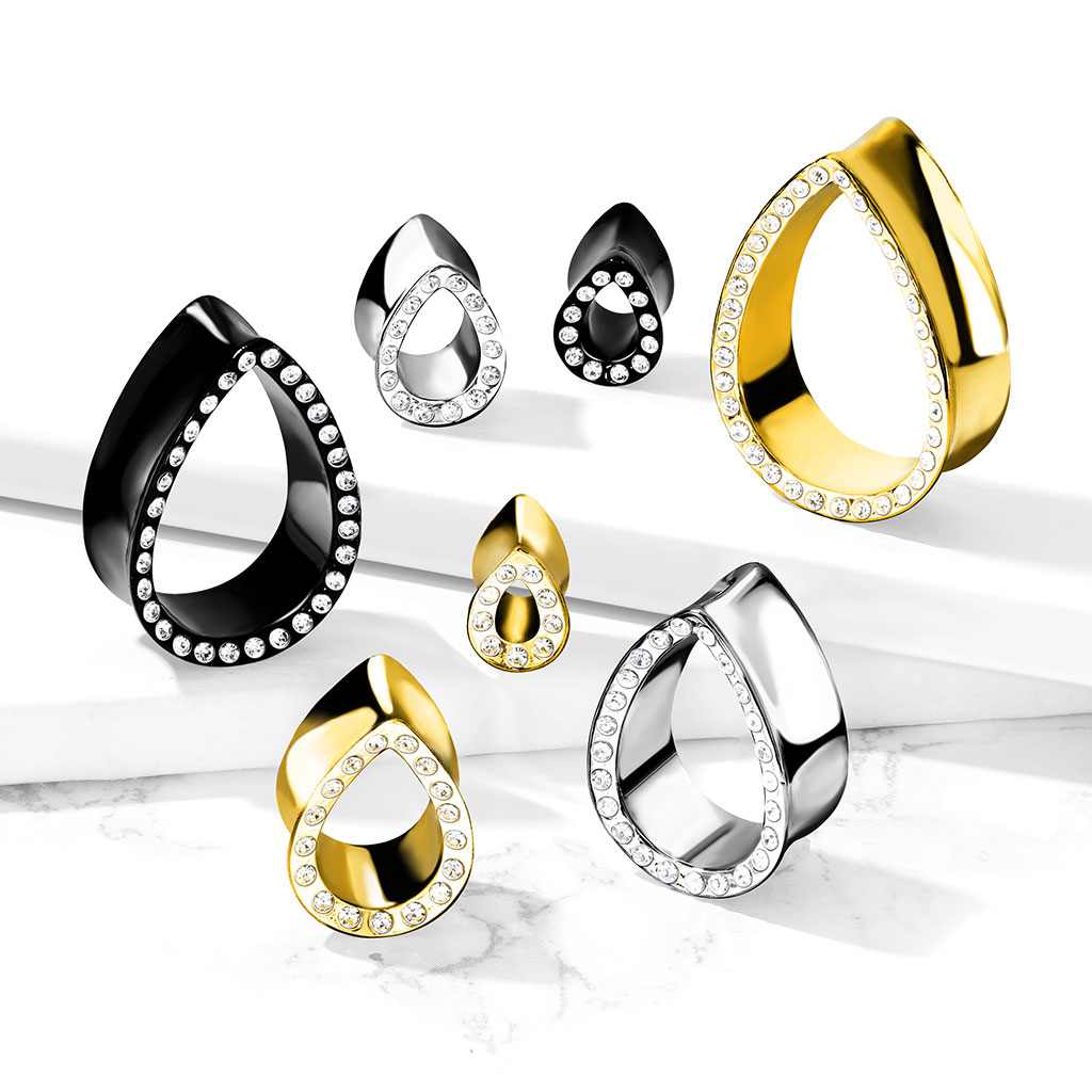 A legtöbb fültágító alagút kerek. Ennek az alagútnak csepp alakja van, de egy körtére is hasonlít. Ahogy a képen is látod, három gyönyörű színben kapható. Az összes modellben közös, hogy a szélüket apró áttetsző kövekkel díszítették. Minél nagyobb az ékszer átmérője, annál több kő díszíti.