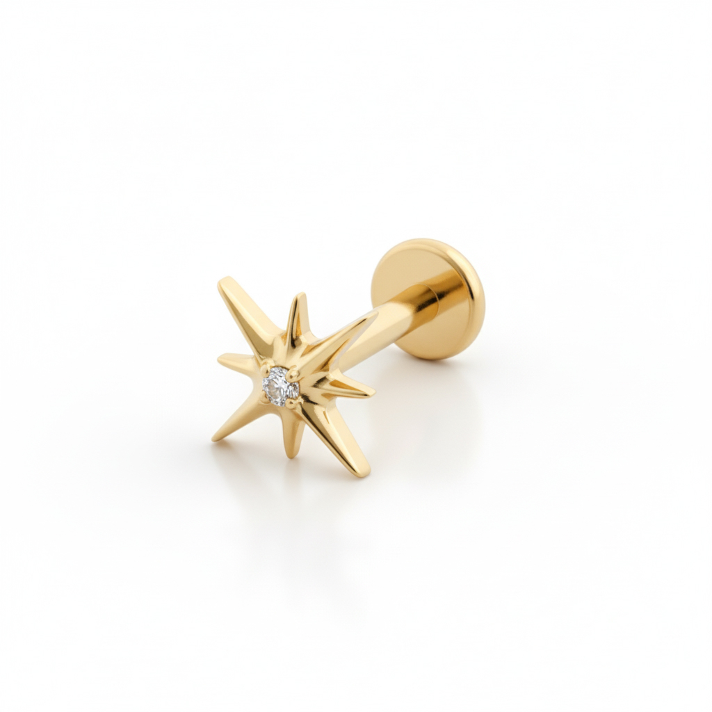 Ez a csillagos titán labret központi kővel azoknak készült, akik szeretik a kozmikus hangulatú ékszereket. A csillag alakú kialakítás egy központi követ keretez. Elérhető arany és ezüst kivitelben, ez a labret kiemelkedő darabja lesz bármely fülékszer-kompozíciónak.