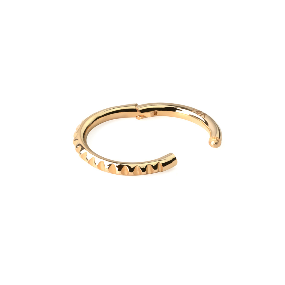 Ennek a karikának a vastagsága 1.2 mm, tehát sztenderd méret ajak- és fülpiercingek esetében. A csuklós ékszereket könnyen ki lehet nyitni a szegmens széthúzásával, majd bezárni annak kattanásig nyomásával. A stílusos piramis minta nagyon egyedivé teszi az ékszert, erről semmiképp nem akarhatsz lemaradni.