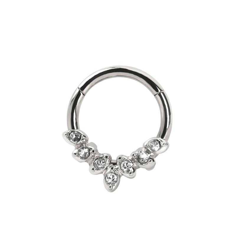 A karika egy PVD bevonattal lett ellátva, ennek köszönhetően több ragyogó szinben is rendelhető. Az ékszert cirkónia köves levelek diszitik, ez 7 átlátszó követ jelent, amik mindegyik szinvariációval jól mutatnak. A csillogó kövek előre néznek, emiatt septum, daith vagy tragus piercingekhez ideális választás az ékszer. Mindenképp vedd figyelembe a karika méretét, amikor a hordását tervezed. A szár 1.2 mm vastag, ami a sztenderd méret arcon hordott piercingeknél, az átmérő pedig 8 mm.