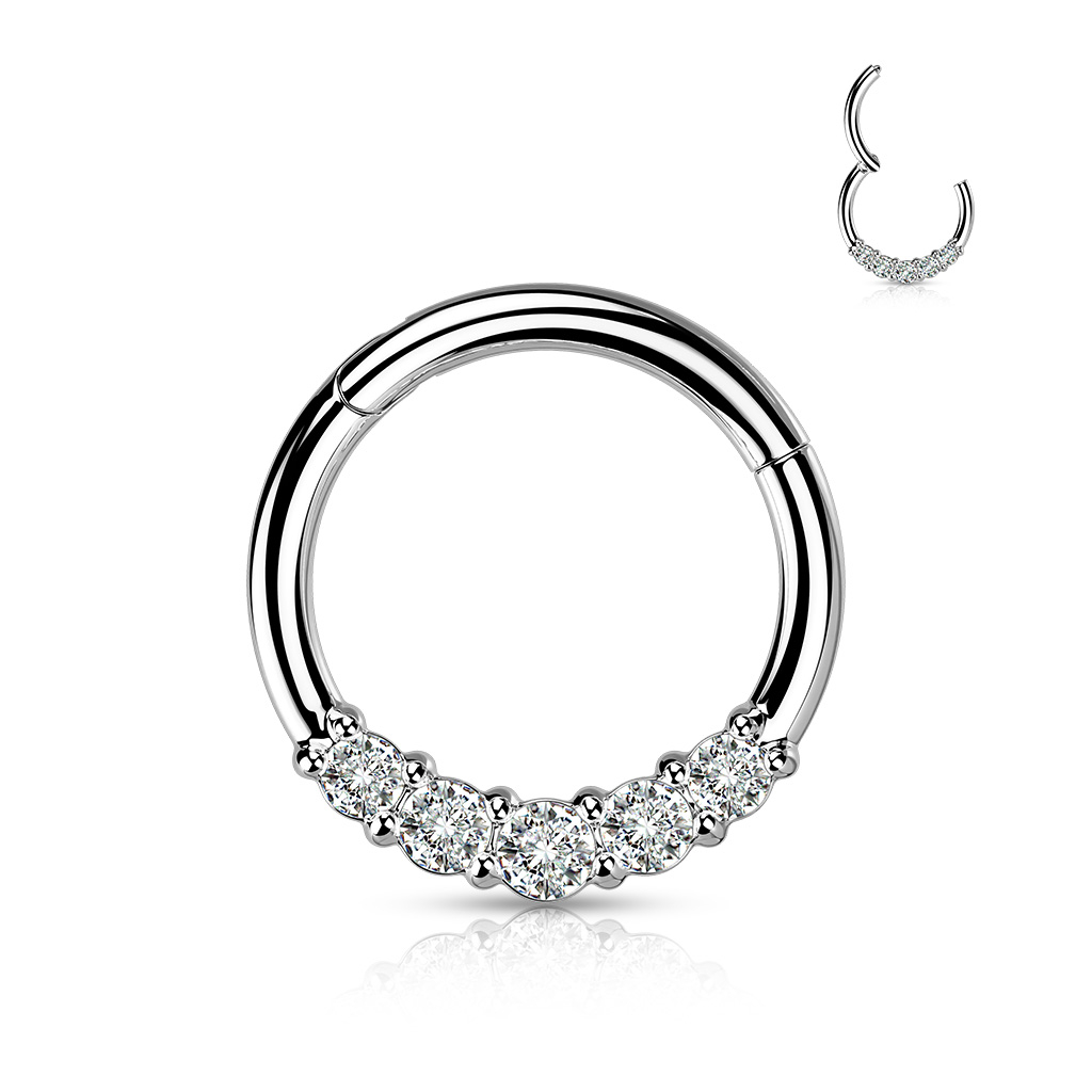 4 különböző szinben rendelhető, ami a tartós PVD bevonatoknak köszönhető. Választhatod a mindig divatos aranyat, a fényűző rózsaaranyat, a merész feketét, vagy a klasszikus ezüstöt. Mindegyik szin ugyanolyan méret és fazon, egyedül a cirkónia kövek szine változhat a szár szinétől függően. A kövek előre néznek, emiatt tökéletes választás lehet septum, daith vagy tragus piercinghez.