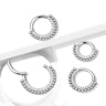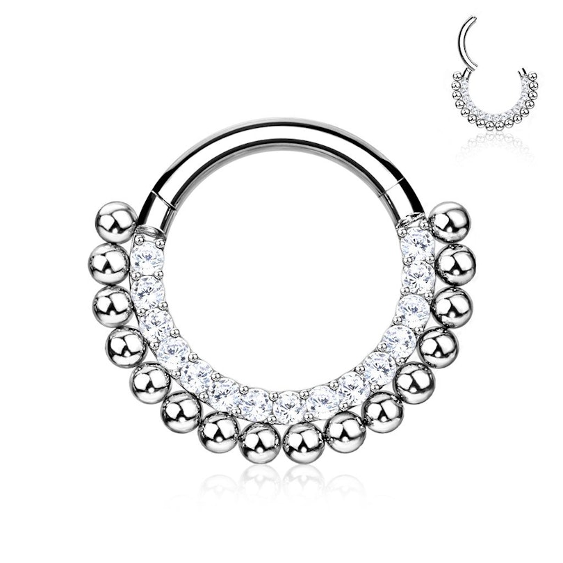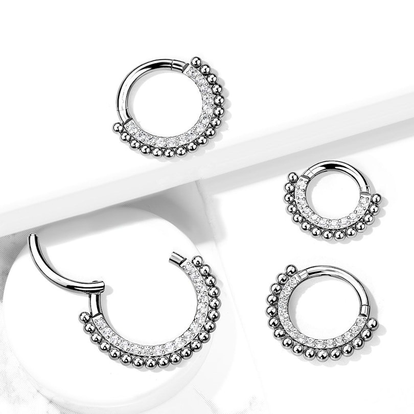 A titán az egyik legalkalmasabb anyag piercingek készítésre, éppen ezért az ilyen ékszer új piercingnek is jó választás. A titánból készült piercingek általában unalmasak, ami azt jelenti, hogy nem tartalmaznak köveket és más díszítőelemeket. Ez az ékszer azonban más, a karikát sok kő és kerek gyöngy díszíti.