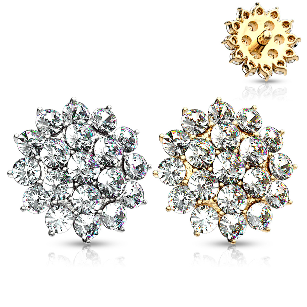 A dísz különleges virág formájú, és most sem spóroltunk a kövekkel, ahogy látod. Rengeteg csillogásra számíthatsz, ha ezt a modellt hordod. A kis köveket karmos foglalatok tartják a helyükön.