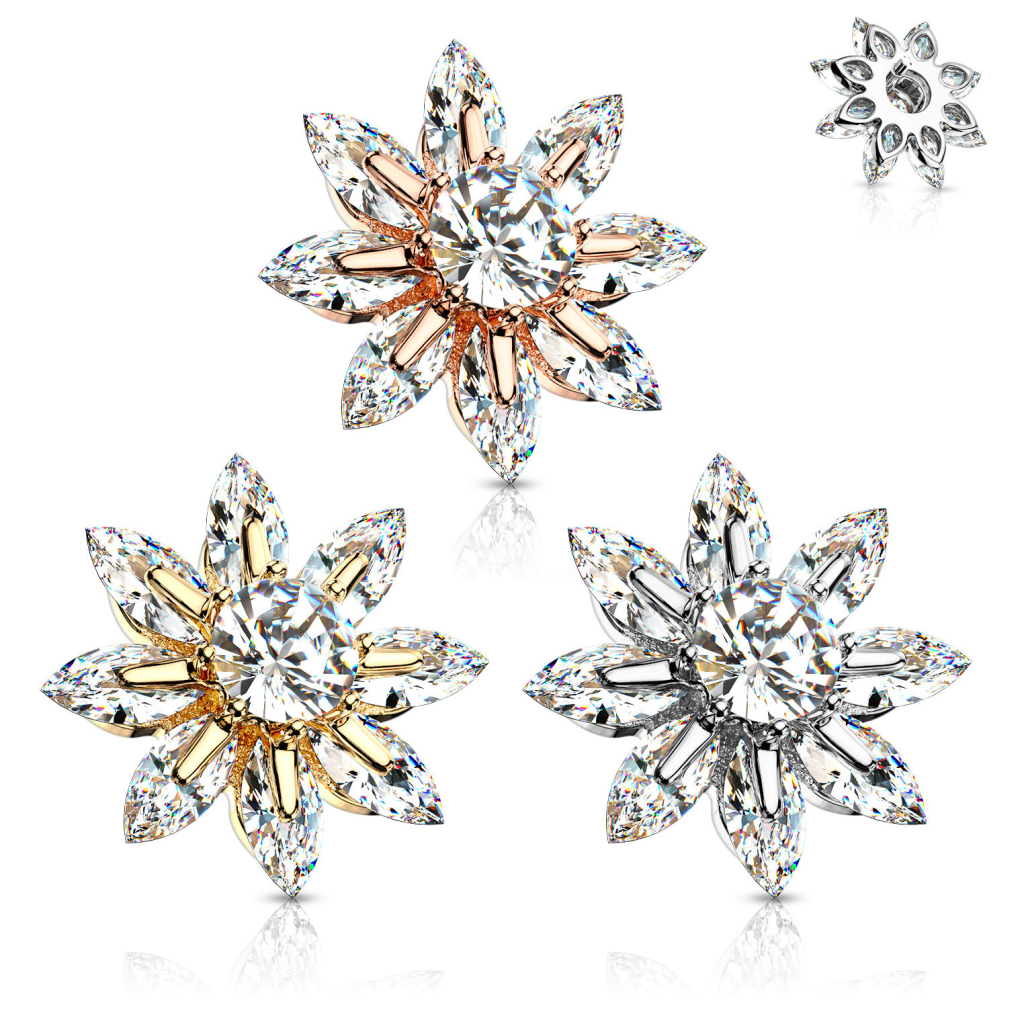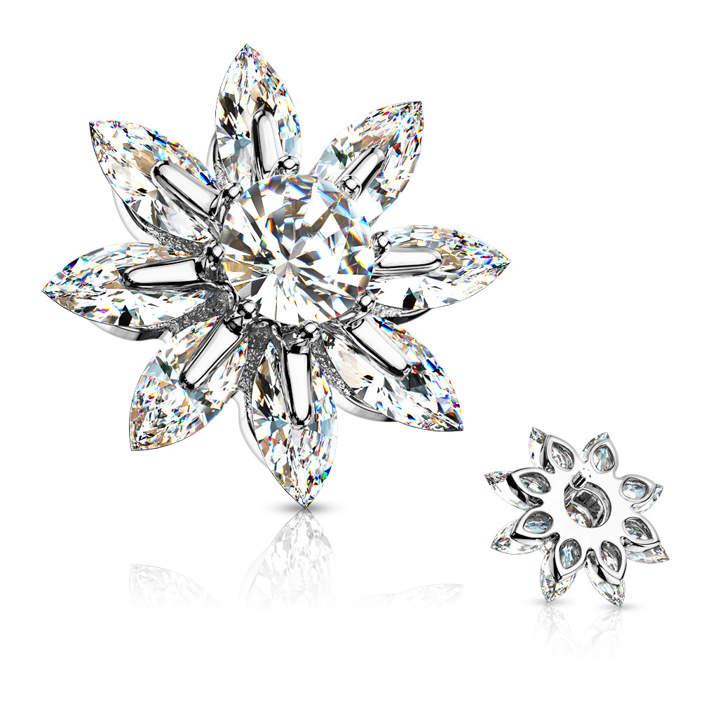 Ez a nem mindennapi dermal fej piercing rengeteg csodálatos kis kővel van kirakva. A középső nagyobb méretű kő egy csodásan csillogó, csiszolt cirkónia, körülötte pedig több ovális formájú kő is található amik a virág szirmait formázzák. Ezeket egy nap alakú réz szerkezet tartja fixen a helyén, ami a dísz tetején helyezkedik el és ugyanígy vannak a piercing hátulján is rögzítve a kövek.