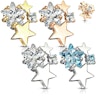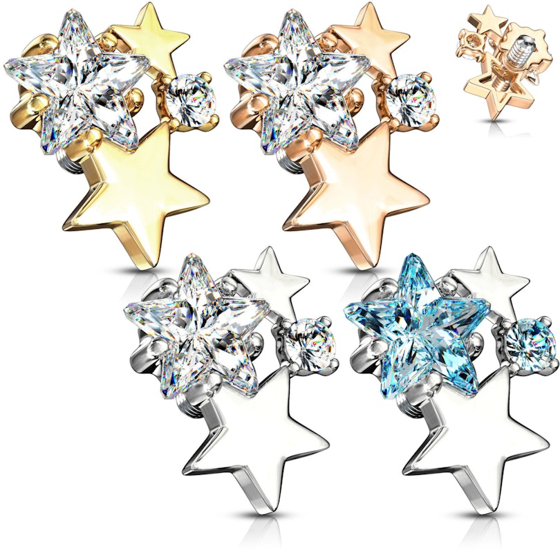 A csillagokat rézből formázták meg, a piercing hátulján található csavaros rész (ami a dermal talpba illeszkedik majd) pedig orvosi acélból készült. A csillagokat különböző fedőrétegekkel látták el, így több színben is elérhetőek számodra.