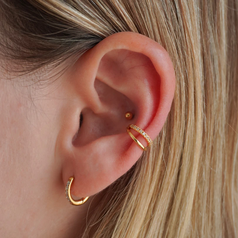 A dupla fülgyűrű cirkóniakövekkel könnyű mód arra, hogy részletet adj a szettedhez anélkül, hogy valódi piercinget szúratnál. Szorosan ül a fülön, két piercing hatását kelti, mégis elég kényelmes a mindennapi viselethez. A kis cirkóniakövek rendezetten, apró karmos foglalatban helyezkednek el, pont a megfelelő mennyiségű csillogást adva. Arany- és ezüstszínben kapható.
