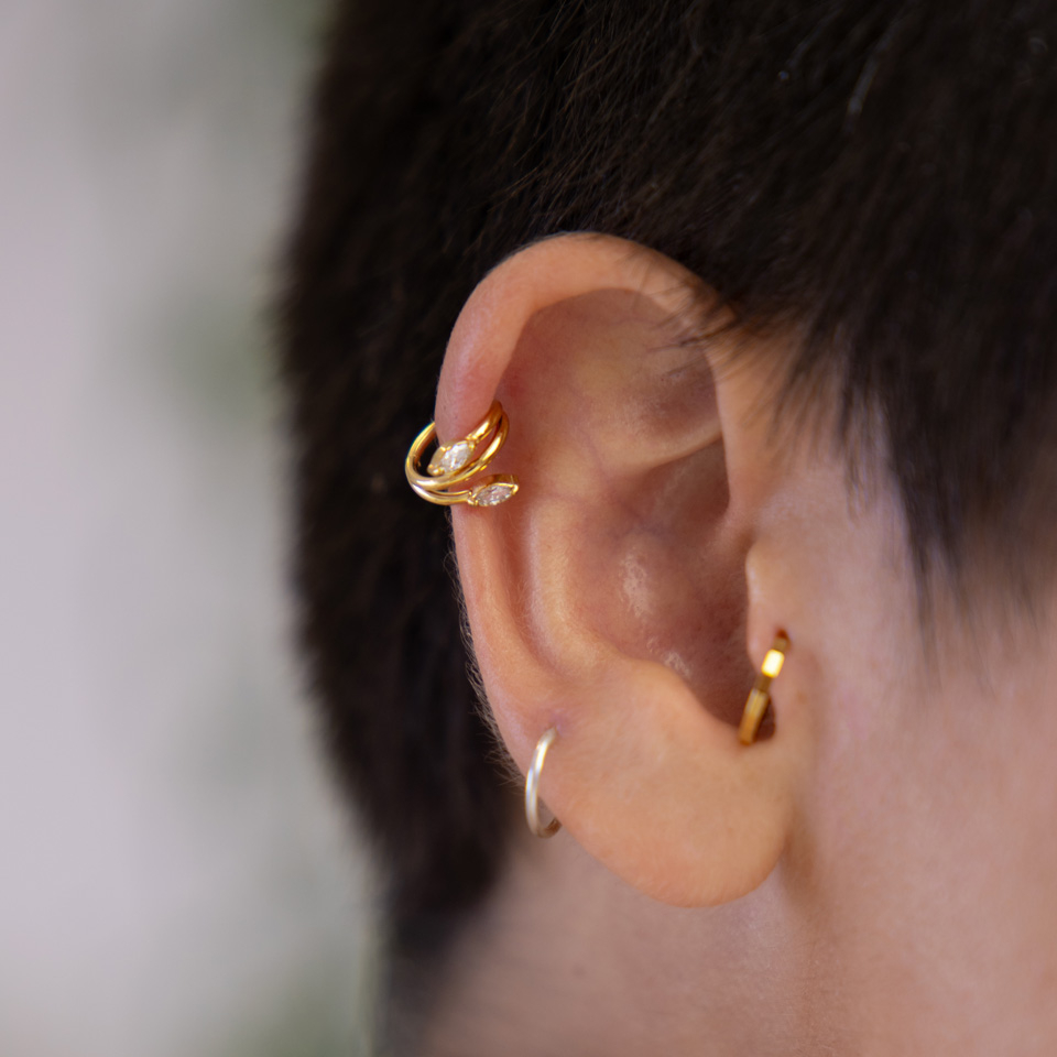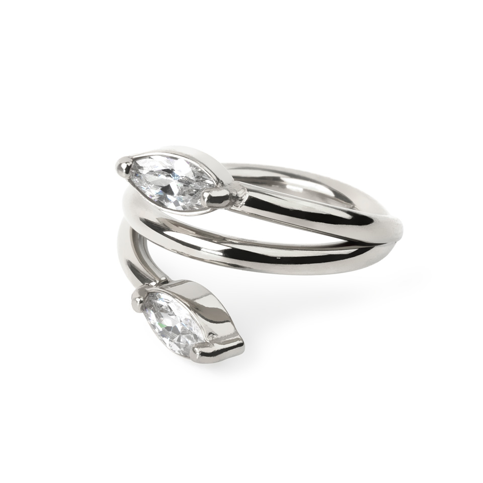 Szép kapcsos karika orvosi acélból. Ez a csodás karika két marquise csiszolású, cirkónia kővel van díszítve, melyek levelekre hasonlítanak. Elérhető 8 és 10 mm-es átmérővel arany és ezüst színben. Ez a sokoldalú darab gyönyörűen mutat minden fülpiercingben, főként a porcos piercingekben, így például a helixben és a rookban.