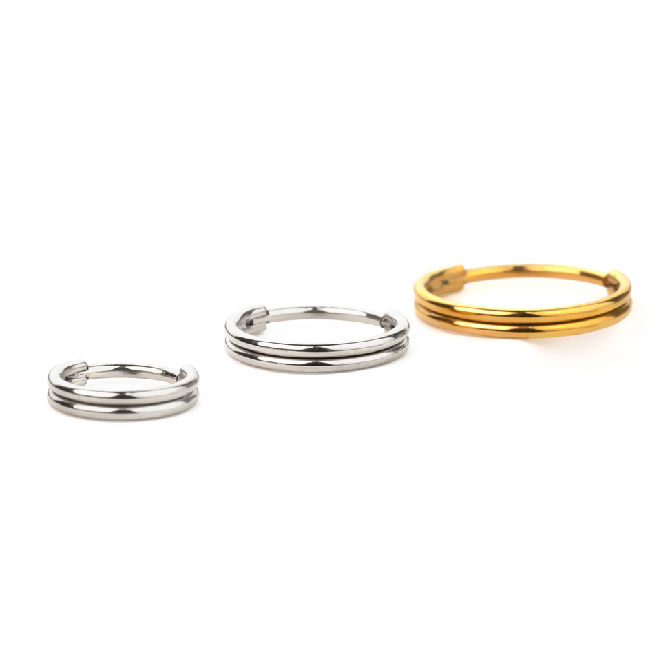 Ez a kapcsos karika olyan, mintha két karika helyezkedne el egymás mellett, de valójában csak egy megy át a piercingen.