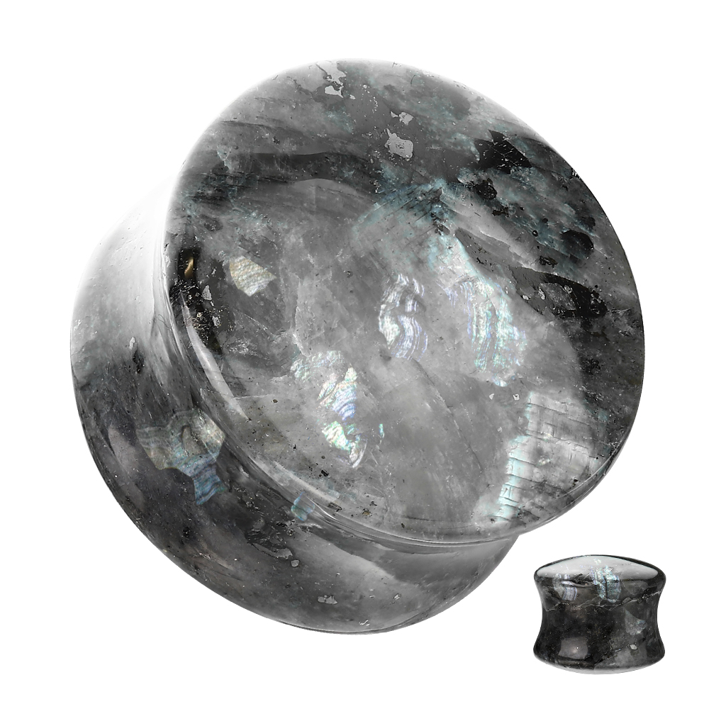 Ez a dupla peremű plug kézzel készült fekete labradoritból, amely egy természetes ásvány. Mivel ez a termék természetes alapanyagú, a darabok között eltérések lehetnek. A kő színe a sötétszürkétől a feketéig változhat, felületén ezüstös játékkal.