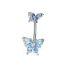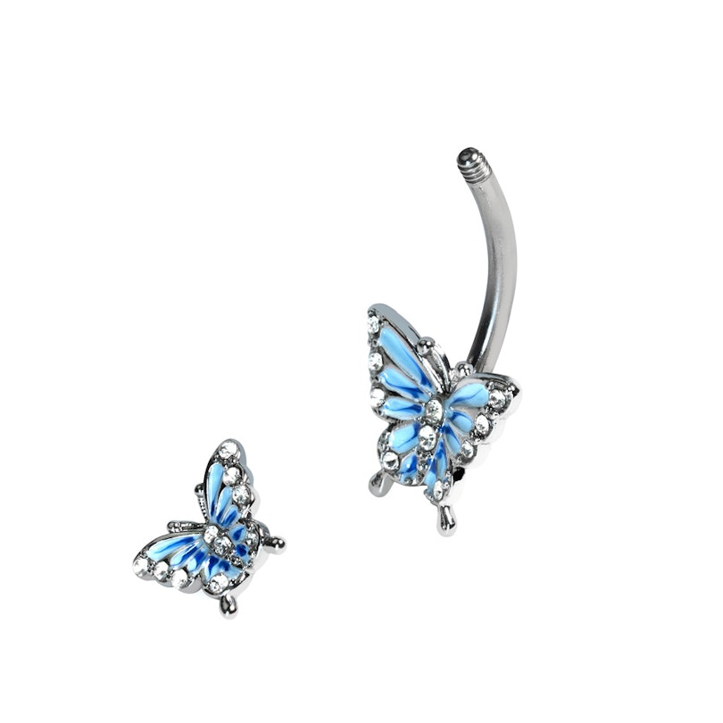Ez a köldökbarbell nem egy, hanem két imádnivaló kék pillangót ábrázol: egy nagy szépség alul, kecses párja pedig felül. Mindkét pillangó teste és szárnyai apró, csillogó kövekkel vannak kirakva.