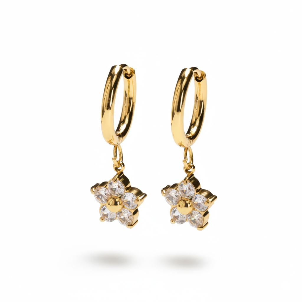 A virágmedállal díszített karika-fülbevaló a reflektorfényre készült. Mindkét karikán egy-egy apró virág alakú medál tündököl csillogó kövekkel, finom karmos foglalatban, épp annyi részletet adva, hogy mozgás közben megakadjon rajtuk a tekintet. Az a fajta fülbevaló, amire rákérdeznek. A karikák kapcsos zárral készülnek, így könnyű felvenni és viselni őket. Arany- és ezüstszínekben kaphatók.