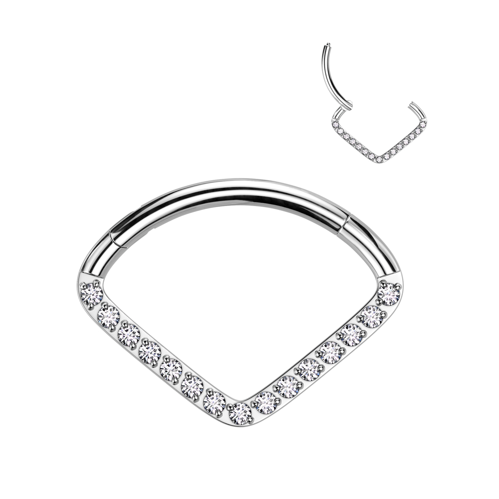 Csillogásra vágysz? Megvan a megoldás. Ez a gyönyörű karika egy időtlen ék formát kapott, szögletes oldala pedig tiszta cirkónia kövekkel van kirakva. Az ívelt fele, ami a piercingbe megy, természetesen sima az optimális kényelem érdekében. Garantáltan szemet gyönyörködtető darab. Kapcsos zárja könnyen használható, így gyorsan felveheted ezt a szépséget amikor eljön a ragyogás ideje.