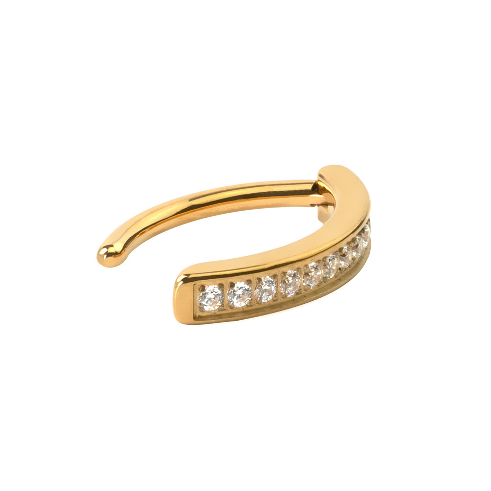 Ez az elbűvölő köldökclicker egy sor tiszta ékkővel van díszítve, hogy ragyogóvá varázsolja megjelenésedet. A clicker lapos íve által közelebb ül a testhez, mint egy hagyományos karika, így praktikusabb a viselése. Implantátum minőségű titánból készült, ezért hipoallergén, könnyű és tartós.