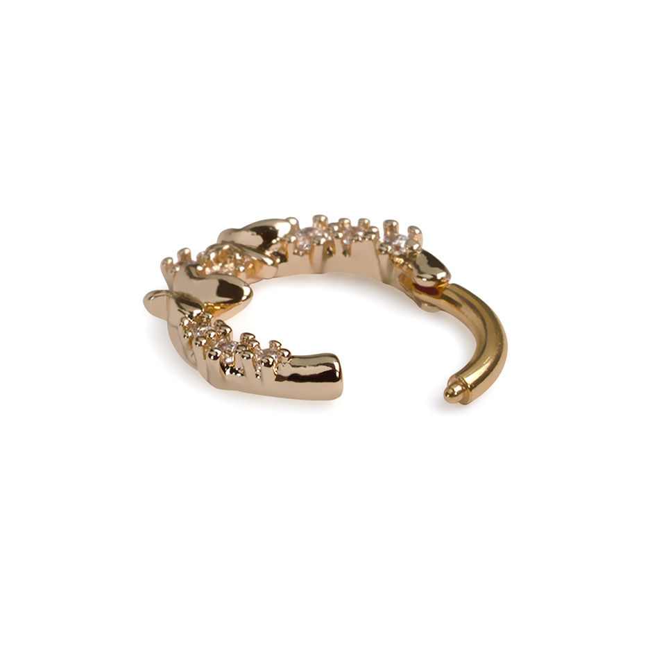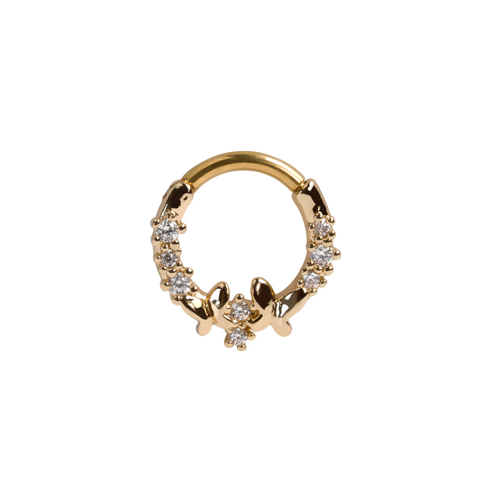 Ezt a szupercuki előre néző karikát két pillangó díszíti, amelyeket apró cirkónia kövek vesznek körül. Mivel a karika kapcsos zárral rendelkezik, könnyű rögzíteni a piercingedben.
