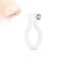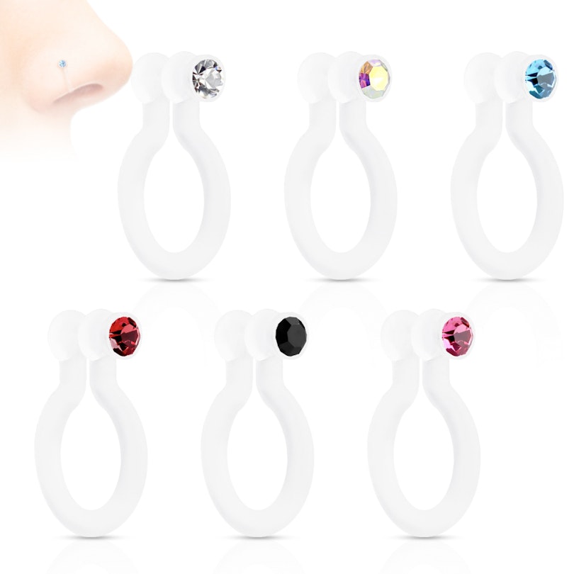 A karika külső részén egy kis kő van, a lapos műanyag szélek megkönnyítik a behelyezést. Az eredmény egy apró kő az orrodon, amely az átlátszó műanyag részeknek köszönhetően úgy néz ki, mint egy valódi piercing. Az ékszer hat különböző színben kapható. Ha nem tudsz választani, a kedvező ára miatt akár hármat is rendelhetsz belőle :)