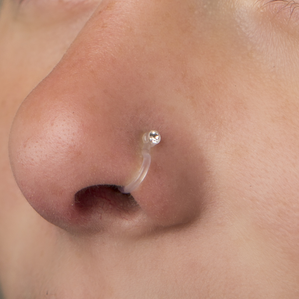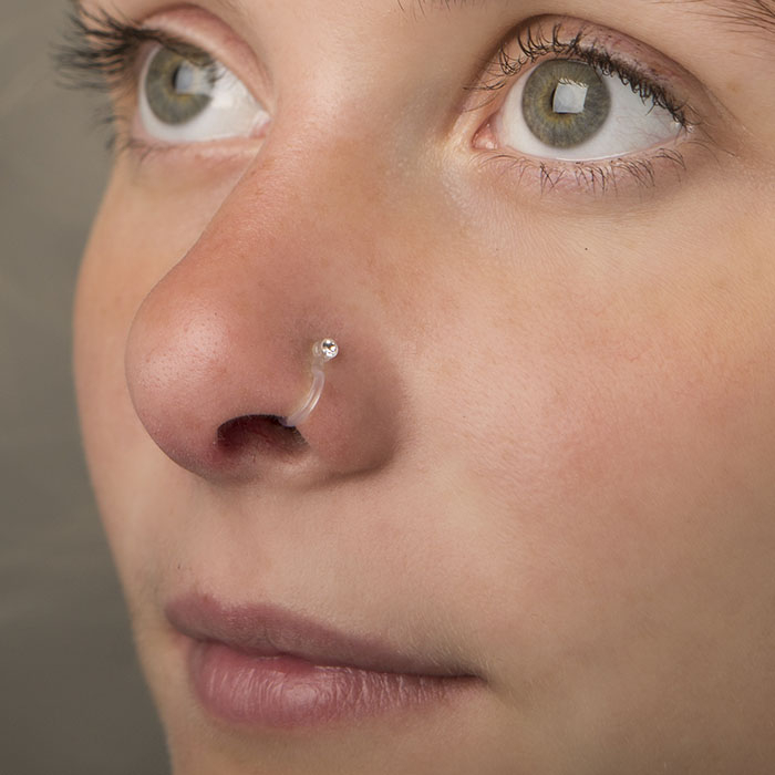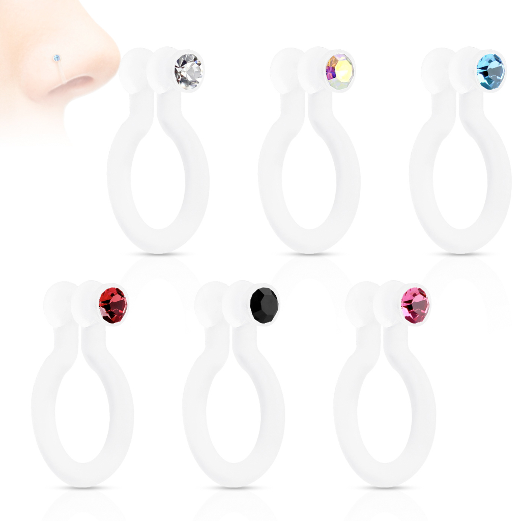 A karika külső részén egy kis kő van, a lapos műanyag szélek megkönnyítik a behelyezést. Az eredmény egy apró kő az orrodon, amely az átlátszó műanyag részeknek köszönhetően úgy néz ki, mint egy valódi piercing. Az ékszer hat különböző színben kapható. Ha nem tudsz választani, a kedvező ára miatt akár hármat is rendelhetsz belőle :)