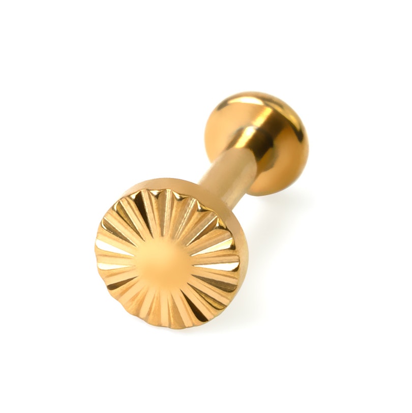 Ez a stílusos labret kör alakú dísszel tündököl, amely középpontjából gravírozott vonalak indulnak ki. Belső menetes, lapos talpas, így biztosítva a kényelmes viseletet és az egyszerű rögzítést a piercingedben. Implantátum minőségű titánból készült, ezért a labret hipoallergén és alkalmas érzékeny bőrhöz. Választhatsz arany vagy ezüst színűt, azt, amelyik stílusodhoz illik. 1,2 mm szárvastagságú, hosszúsága pedig választható. A legtöbb fül- és ajakpiercinghez illik.