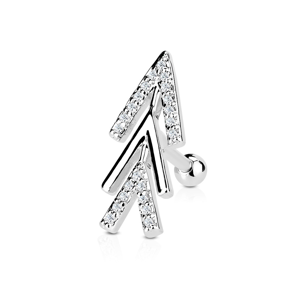 Ha feltűnő fülpiercinget keresel, jó helyen jársz. Az itt látható ékszer elejét egy gyönyörű, három nyílból álló absztrakt minta díszíti, a nyilak mérete felfelé egyre nő. Az alsó és a felső nyilat kövekkel rakták ki, a középsőt viszont nem díszítették. A minta anyaga sárgaréz, amely az ékszer többi részének színével megegyező bevonatot kapott. A szár orvosi acélból készült, amelyet szintén bevonattal láttak el. Az ékszer különböző színekben kapható, a rózsaarany színű modell színét a 14 karátos rózsaarany bevonatnak köszöneti.