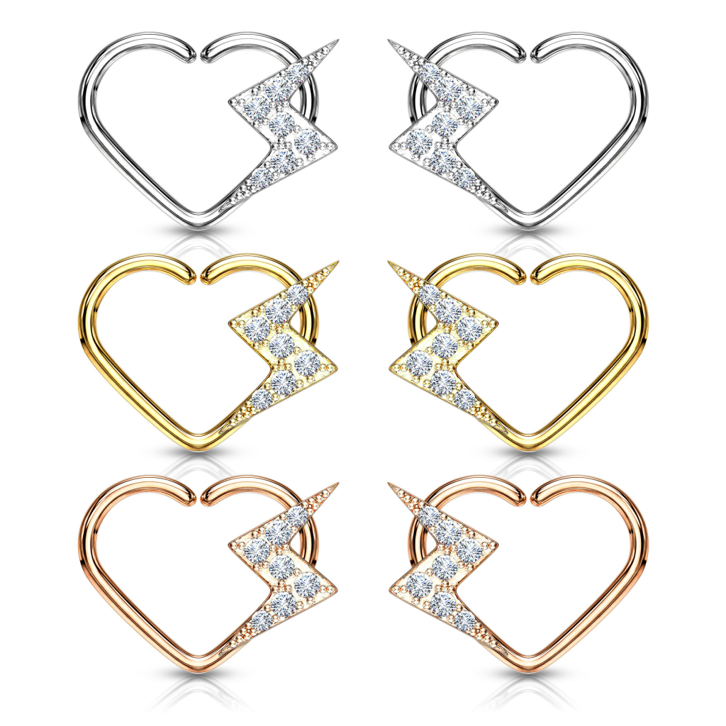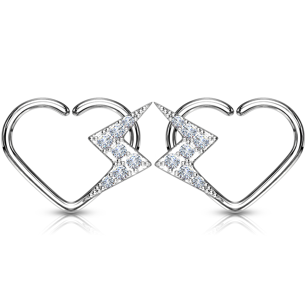 A képen látható fülpiercing szív alakú; az egyik fele a füleden kell átmenjen, míg a másik felén egy csodás villám díszeleg.