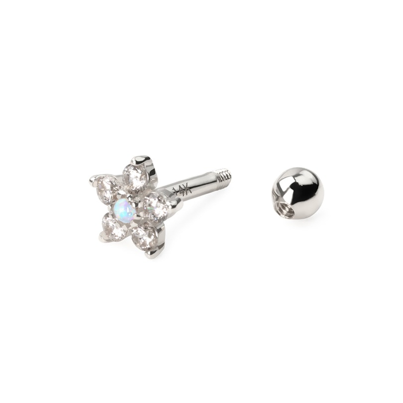 A száron egy aranyos kis virág formájú dísz található, közepén egy nagyobb szintetikus opál kővel. A virág szirmai továbbá áttetsző kövekből állnak, így különlegesen szép és csillogó lesz az ékszer összhatása.