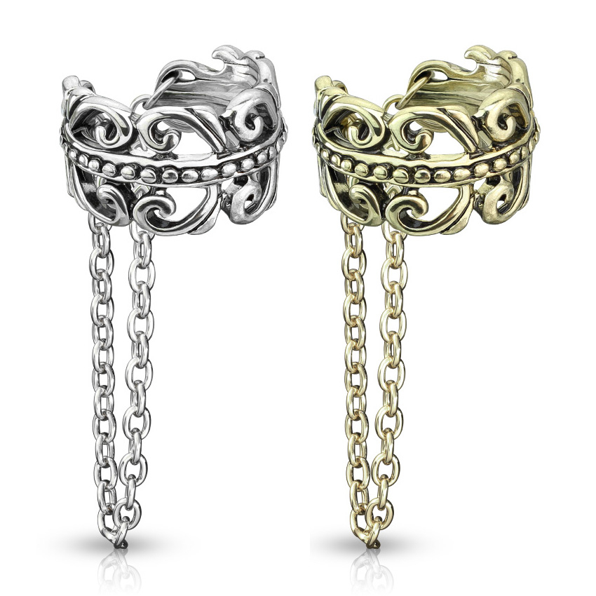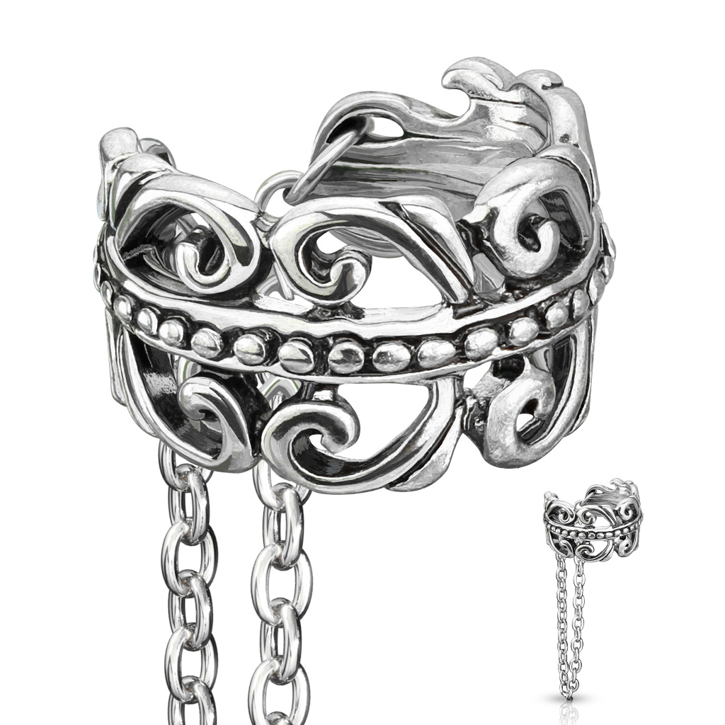 A gyűrűről egy gyönyörű lánc lóg, kb. 30 mm hosszú. Viselet közben olyan hatást kelt, mintha a füledből csüngene alá.