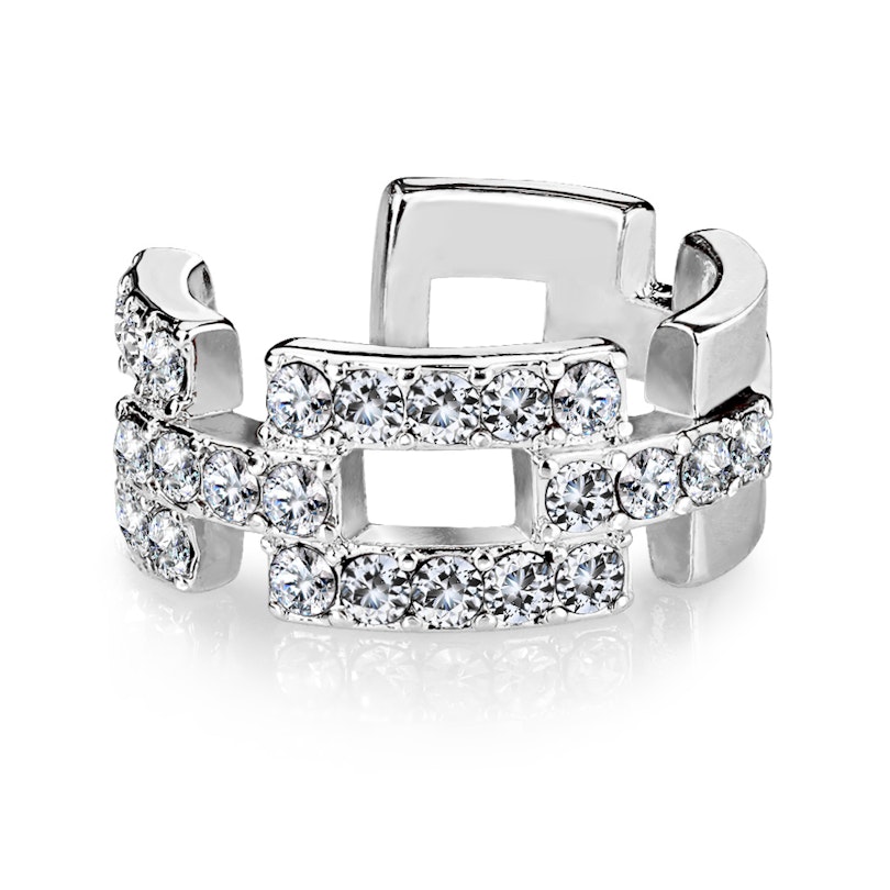 Az ékszeren több négyzet van egymás mellett, mintázata egy láncra emlékeztet. A külső részen elhelyezkedő négyszögeket öt kővel díszítették, így biztosan ragyogni fogsz.