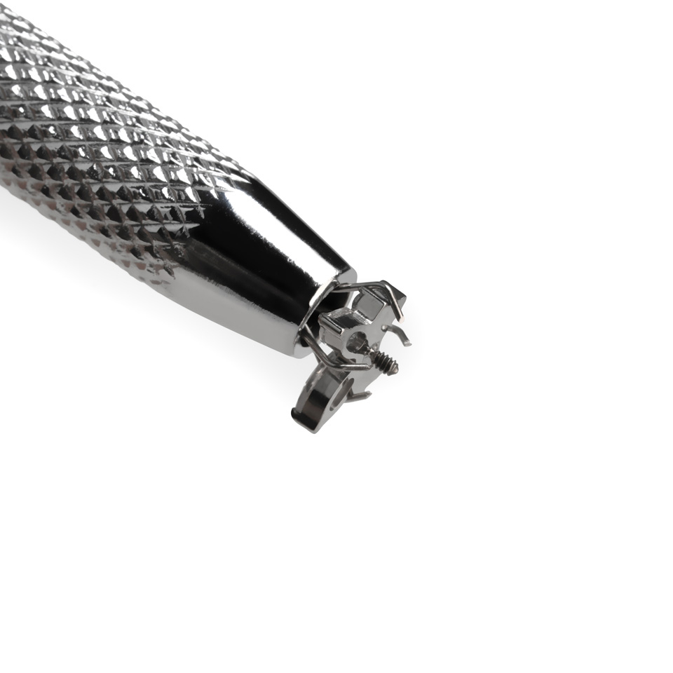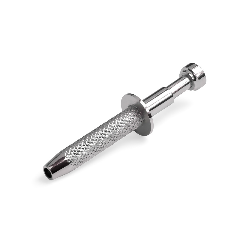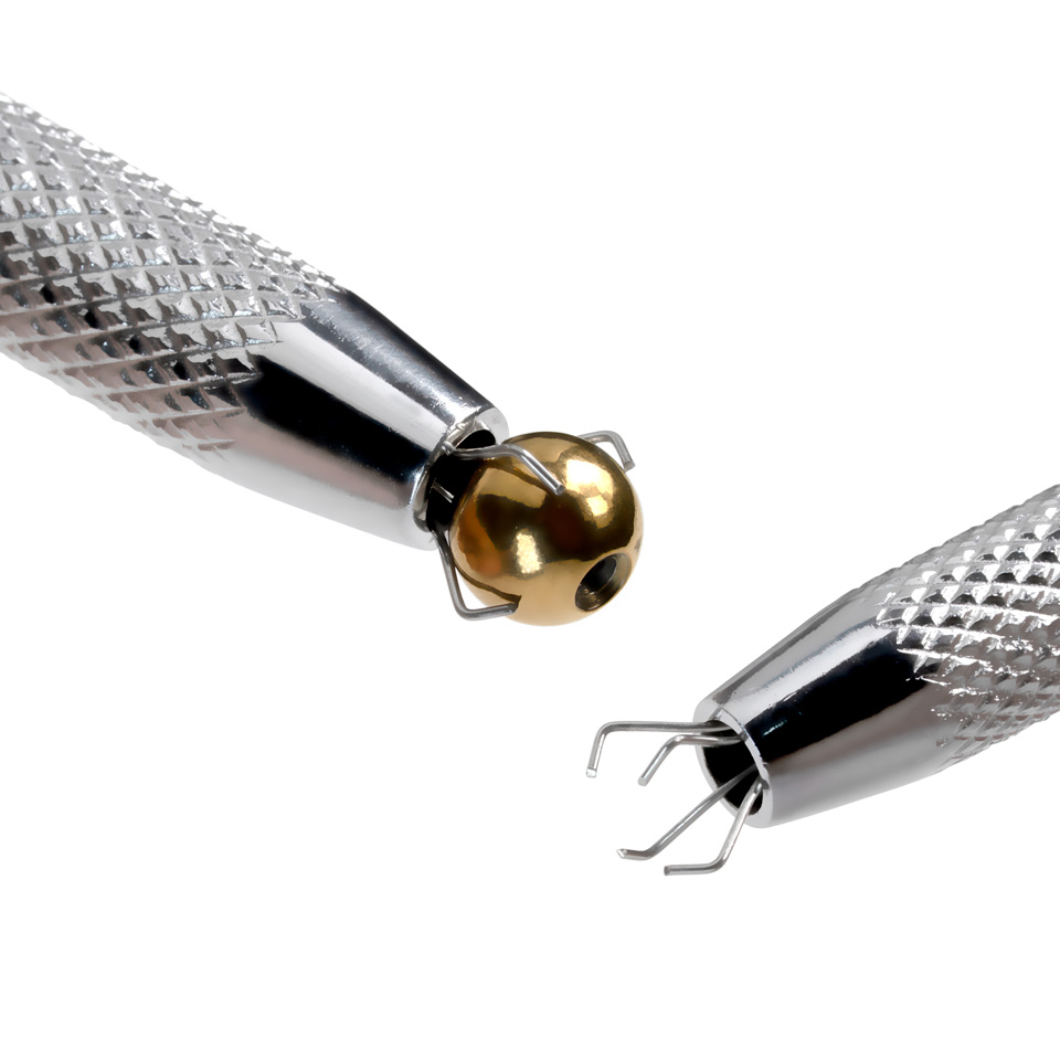 Az eszköznek négy vékony karma van, amik úgy jönnek elő, hogy az eszköz hátsó részén lévő pöcköt benyomod. 3 és 6 mm közötti golyókat tudnak megtartani, miközben barbellbe, karikába vagy labret szárba csavarod őket. Ügyelj arra, hogy a golyón lévő lyuk vagy menet kifelé nézzen, hogy rá tudd csavarni a golyót a szárra.