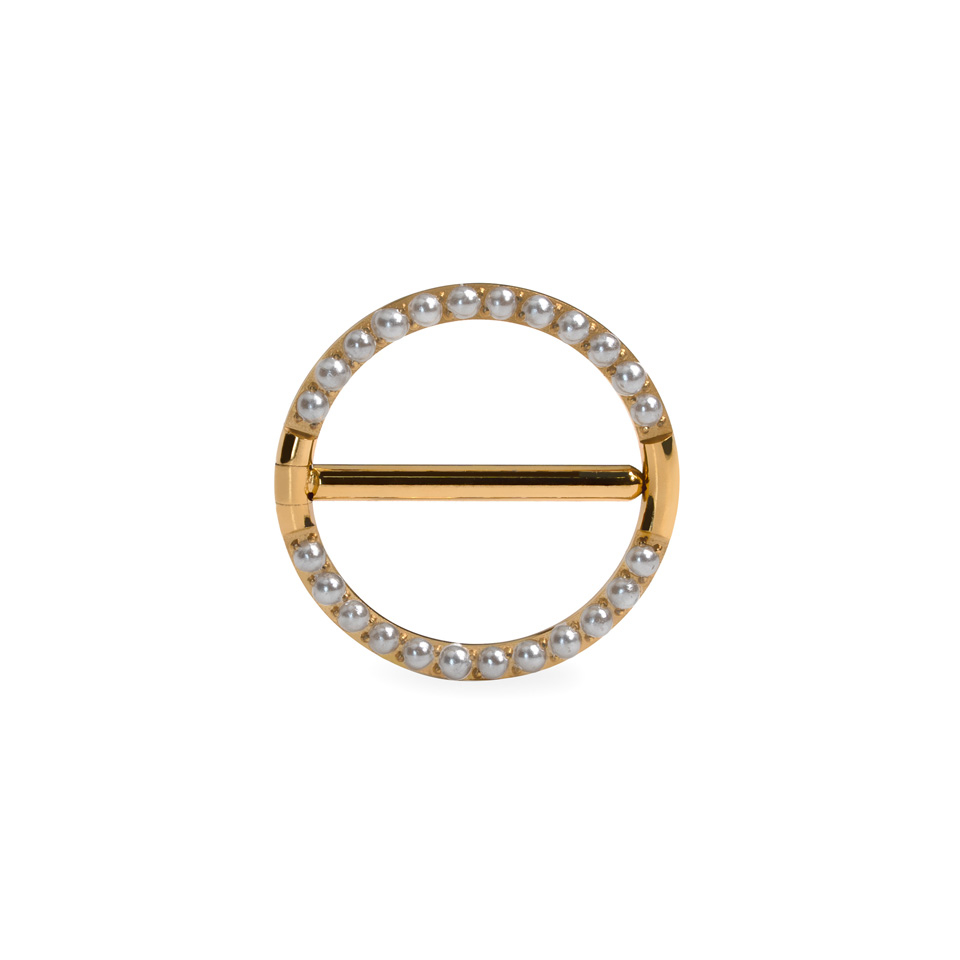 A gyöngyökkel kirakott titán mellbimbópiercing bebizonyítja, hogy a gyöngyök nem csak nyakláncokra illenek. A teljes kört alkotó, karmokban foglalt gyöngyök, arany vagy ezüst kivitelben, játékos magabiztossággal keretezik a piercinged.