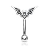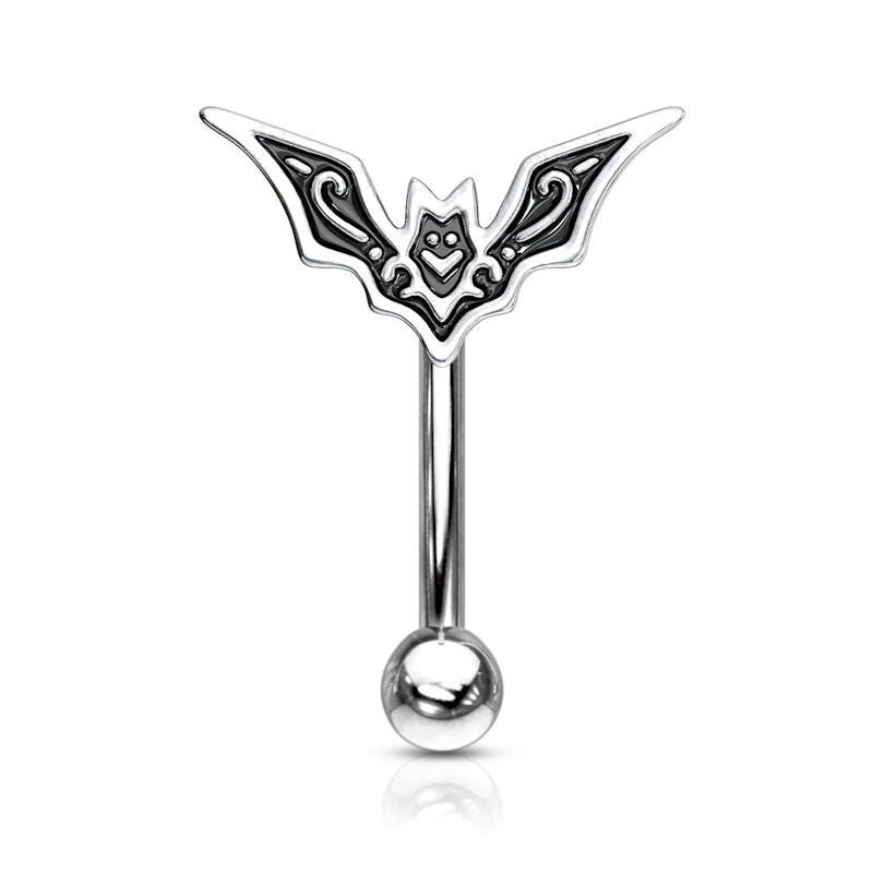 Az ékszer szárán szimmetrikus, nyitott szárnyú denevér ül. Olyannyira részletes, hogy szemeit és mosolyra húzódó száját is könnyedén ki lehet venni. Az ékszer alján 3 mm-es golyó található.