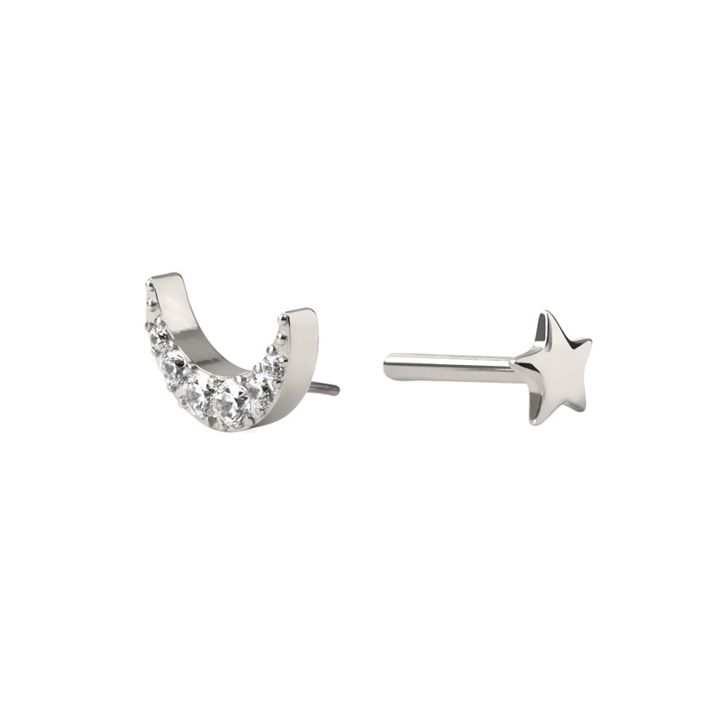 Ez a szép, titánból készült labret egy cirkónia kövekkel kirakott holddíszt kapott. Csillag alakú hátoldala miatt tökéletes olyan piercingekbe, ahol az ékszer mindkét oldala látható.