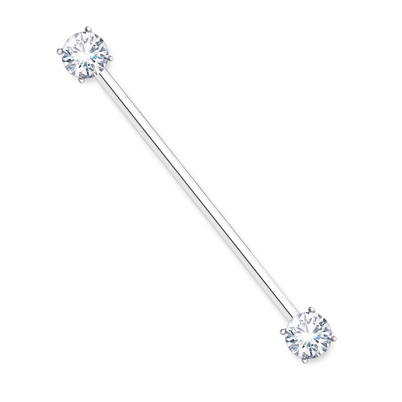 Egy nem szokványos, egyenes barbell szárú industrial piercinget látsz, ami mind a két végén díszített. A szár rozsdamentes acélból készült, végein cirkónia kövek ülnek.