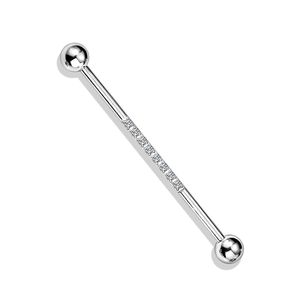 Ha rendelkezel industrial piercinggel a füledben, akkor mindenképp tekintsd meg ezt az ékszert. Egyenes szárból, és két zárógolyóból áll. A szár közepén 8 apró kövecske van elhelyezve, tökéletes elosztásban. Orvosi acélból készült, és többféle szinben rendelhető, a szár is és a kövek is. A kövek szine csak az ezüst szinű szár esetében választható. Minden más szár esetében a kövek átlátszóak.