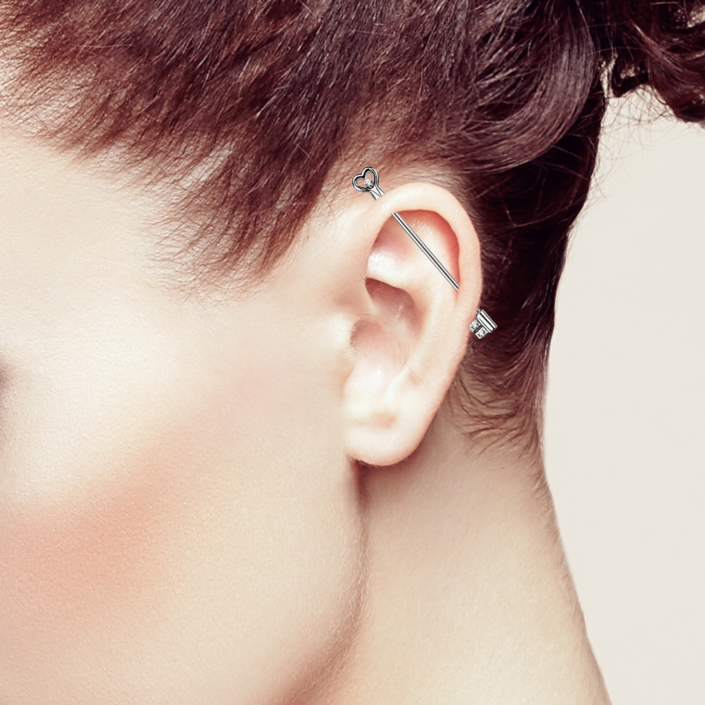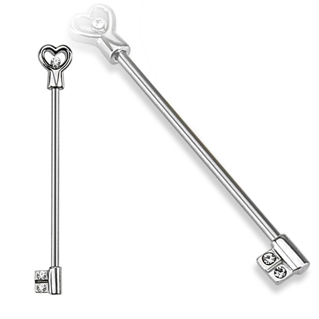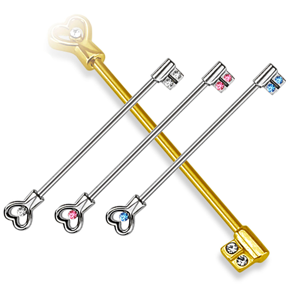 Kecses, finom és elegáns, egy szóval tökéletes industrial ékszer. Édes és nőies dizájn; egy kulcs szivmotivummal. A kulcs fogait és a szivet pici kövek diszitik. Válaszd őket neked tetsző szinben: fehérben, rózsaszinben vagy türkizben.