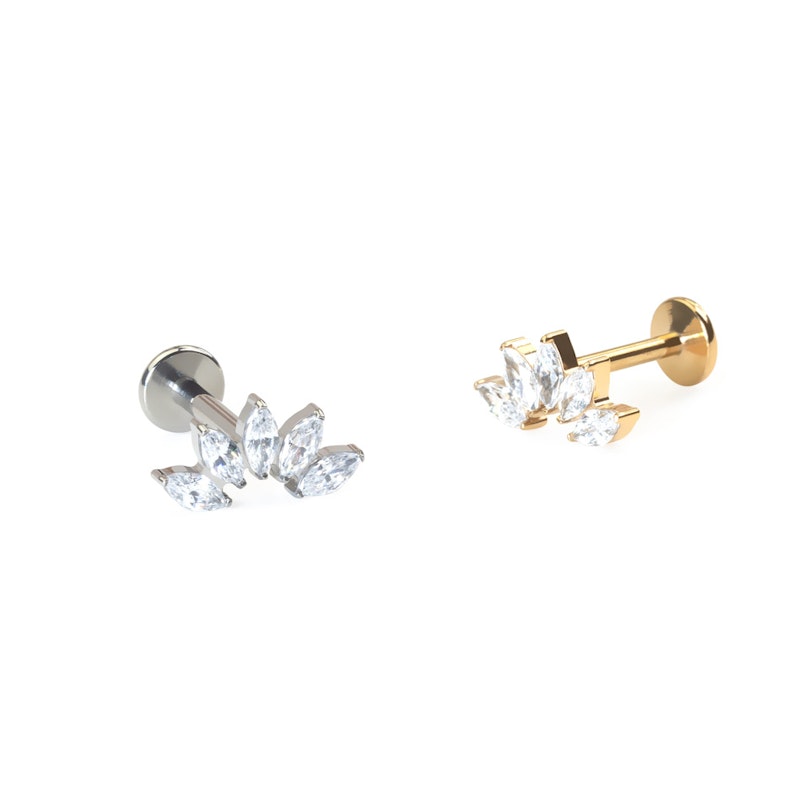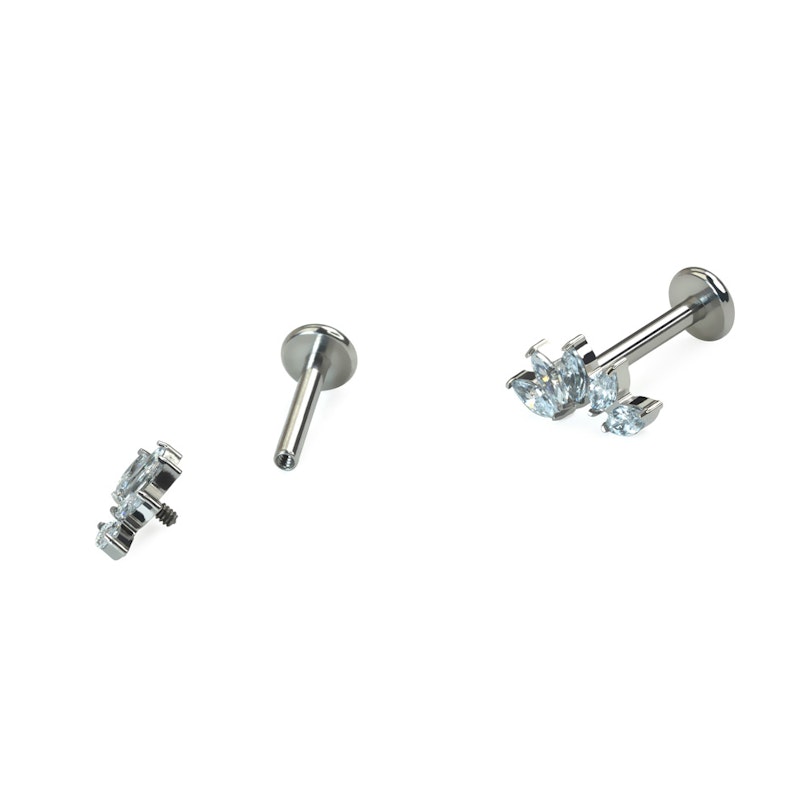 Ez a titán labret 5 darab, marquise csiszolású cirkónia kővel van díszítve, melyek ívben lettek elrendezve. Az ékszer belső menetes, így a sima felületű szárat kell egyszerűen a piercingbe helyezni, majd a felső részt a helyére csavarni. Titánból készült, ami érzékeny bőrűek számára is kényelmes viseletet biztosít. Viselhető többféle fülpiercingben is, de különösen jól mutat helix vagy flat piercingben.
