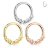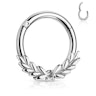 Ez a kapcsos karika orvosi acélból készült, az alsó részét az odlalán felfelé futó levelek díszítik. A levelek azért nem veszik körbe az egész karikát, mert akkor a viselése lehetetlen lenne.