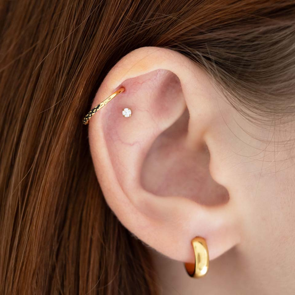 A bemart kígyóbőr minta merész és elbűvölő hatást ad egy kapcsos szegmenskarikának. Az ékszer ezüst és arany színben kapható, mindkét esetben oxidáló eljárással készül az igazi kígyóbőr érzet eléréséért. A karika 2 átmérővel rendelhető: 8 mm és 10 mm, illetve 2-féle szárvastagsággal: 1 mm és 1,2 mm. Ez a sokoldalú ékszerdarab használható fülben, septumban vagy ajakban is.