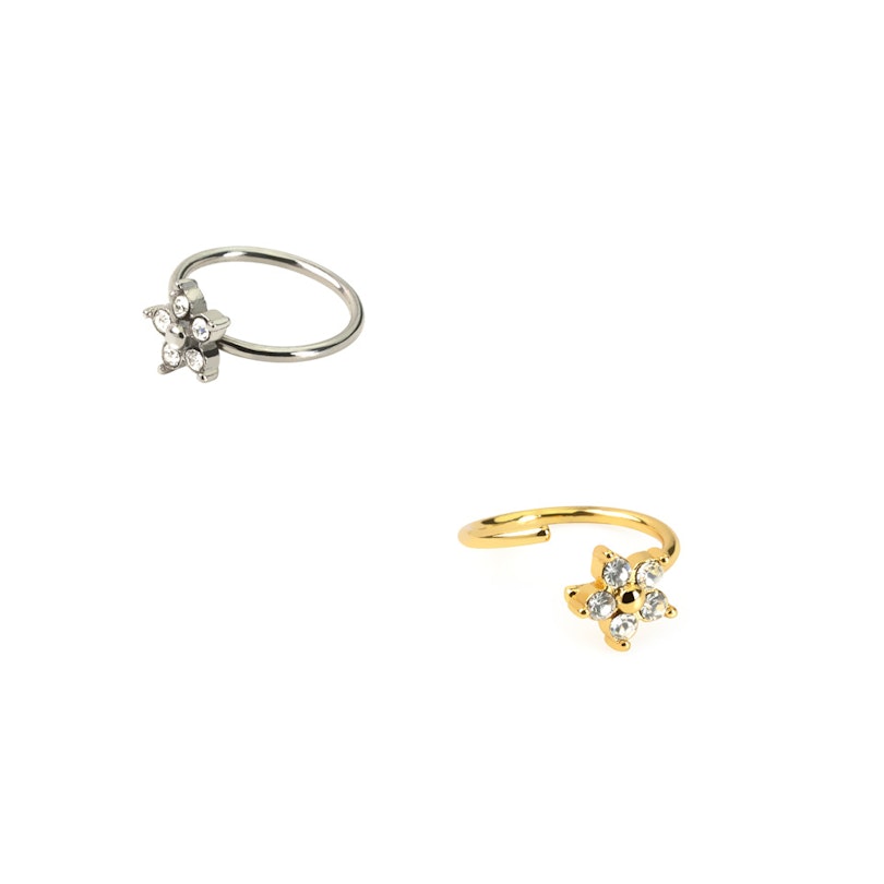 Ezen a kecses, orvosi acélból készült karikán egy ízléses virág ül, amely öt drágakősziromból és egy központi gyöngyből áll. Az ékszer elérhető arany és ezüst színben, orvosi acélból készült, ezért erős, tartós és nem veszít fényéből. Vékony szára (0.8 mm / 20g) miatt ideális orrpiercingekhez, de helix és más fülpiercingekben is hordható. Csavard el egyszerűen, helyezd piercingedbe és csavard el újra a rögzítéshez.