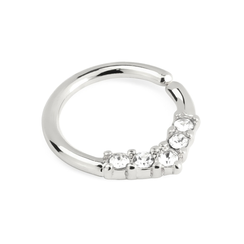 A képen egy csodálatos végtelen karikát látsz. Az ékszer klasszikus módon körben végig kerek, alul viszont kövekkel kirakott, V-alakban végződik. Ha szereted az olyan ékszereket, amivel kitűnhetsz a tömegből, ez a piercing pont neked való.