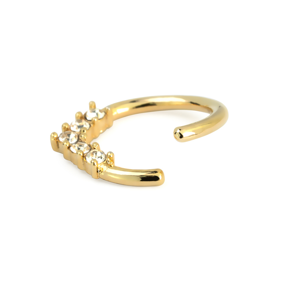 A képen egy csodálatos végtelen karikát látsz. Az ékszer klasszikus módon körben végig kerek, alul viszont kövekkel kirakott, V-alakban végződik. Ha szereted az olyan ékszereket, amivel kitűnhetsz a tömegből, ez a piercing pont neked való.