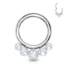 Ez a karika titánból készült, az egyik legjobb piercing alapnyagból. Emiatt is használják sok helyen az ebből készült ékszereket piercingek szúrásakor. A karika vastagsága 1,2 mm, az átmérőt választhatod 8 és 10 mm-ben. Mindkét esetben a karikát öt kristály díszíti. A középső kő a legnagyobb, a többi pedig a szélek irányában kisebbednek.