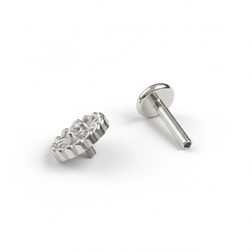 Titánból készült, így hipoallergén, vízálló és strapabíró a mindennapi viseléshez. A belső menetes kialakítással könnyű a behelyezés, és biztonságosan a helyén tartja. Lapos hátlappal rendelkezik, conch, helix, fülcimpa vagy tragus piercingekhez tervezték.