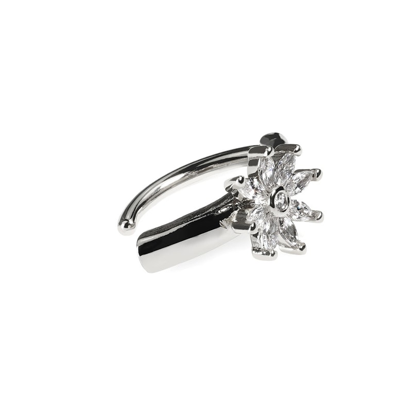 Ennek a stílusos clicker köldökkarikának egy csillogó virág ékeskedik a közepén. A virág 9 köbös cirkóniakőből áll. Az ékszer arany vagy ezüst bevonattal érhető el.