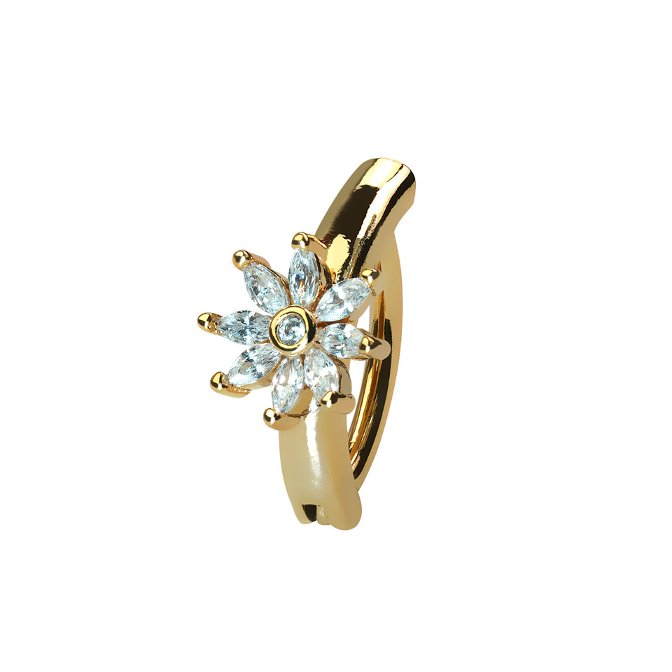 Ennek a stílusos clicker köldökkarikának egy csillogó virág ékeskedik a közepén. A virág 9 köbös cirkóniakőből áll. Az ékszer arany vagy ezüst bevonattal érhető el.