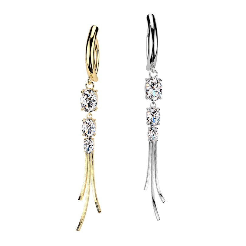 A köldök clicker kövekkel és láncokkal extra részletet ad a köldökpiercingednek. A kövek középen ülnek rendezett karmos foglalatban, míg alulról finom láncok lógnak le, hogy kicsit elegánsabb legyen a megjelenés. Arany- és ezüstszínben kapható; olyan darab, amihez akkor nyúlsz, ha egy egyszerű barbellnél többre vágysz.