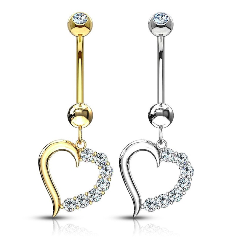 Köldök piercing 14 karátos aranyból, csillogó kövekkel kirakott szív medállal