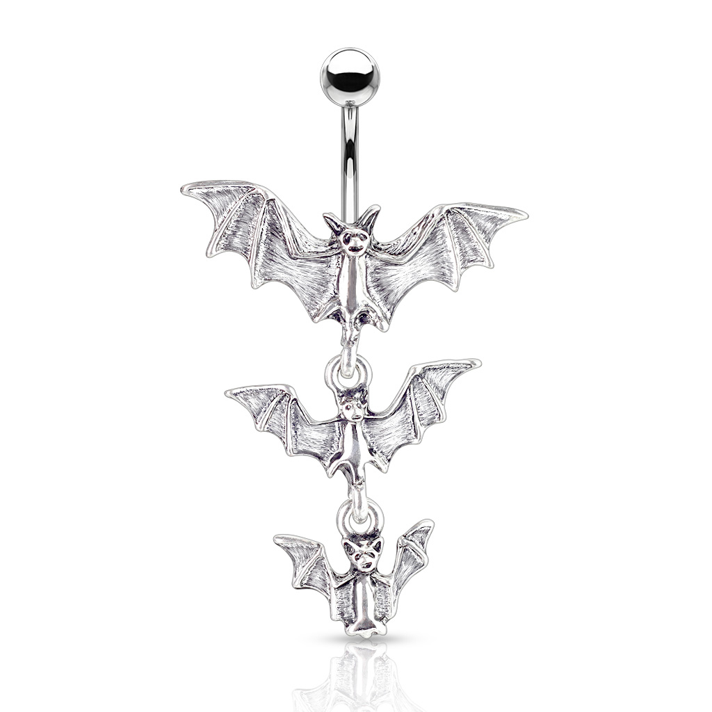 Egy nem mindennapi köldök piercinget fedeztél most fel. Három ijesztő kis denevér lóg egy sorban ezen a különleges darabon. Ha meglátod rögtön Halloween vagy Batman ugrik be, ugyanakkor a denevéreknek természetesen sokkal személyesebb jelentése is lehet - attól függ ki viseli.
